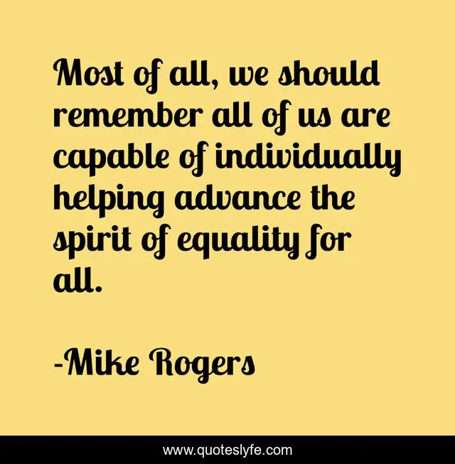 This page presents the quote "Most of all, we should remember all of us are capable of individually helping advance the spirit of equality for all.". Author of this quote is Mike Rogers. This quote is about remember, spirit, capable,.