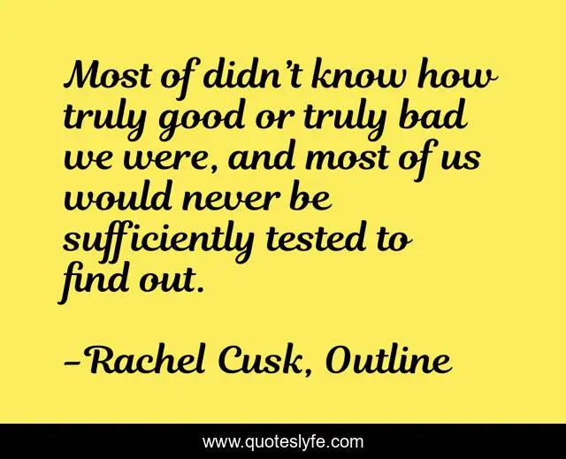 This page presents the quote "Most of didn’t know how truly good or truly bad we were, and most of us would never be sufficiently tested to find out.". Author of this quote is Rachel Cusk, Outline. This quote is about tested, bad, good,.