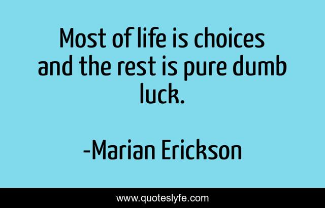 This page presents the quote "Most of life is choices and the rest is pure dumb luck.". Author of this quote is Marian Erickson. .