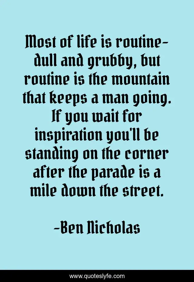 This page presents the quote "Most of life is routine-dull and grubby, but routine is the mountain that keeps a man going. If you wait for inspiration you'll be standing on the corner after the parade is a mile down the street.". Author of this quote is Ben Nicholas. This quote is about life, passion, adventure,.