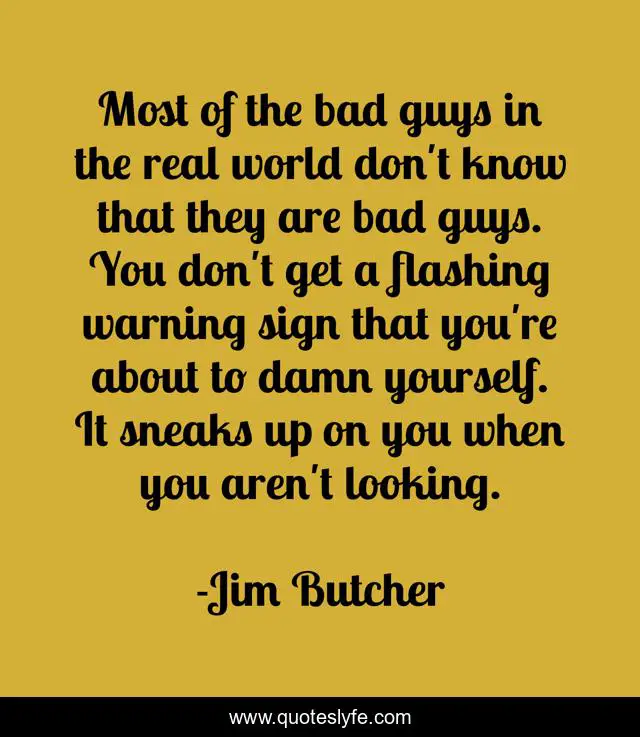 This page presents the quote "Most of the bad guys in the real world don't know that they are bad guys. You don't get a flashing warning sign that you're about to damn yourself. It sneaks up on you when you aren't looking.". Author of this quote is Jim Butcher. This quote is about molly-carpenter, evil, harry-dresden,.