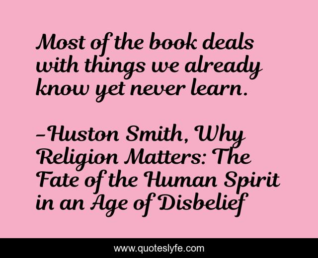 This page presents the quote "Most of the book deals with things we already know yet never learn.". Author of this quote is Huston Smith, Why Religion Matters: The Fate of the Human Spirit in an Age of Disbelief. .