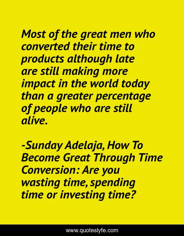 This page presents the quote "Most of the great men who converted their time to products although late are still making more impact in the world today than a greater percentage of people who are still alive.". Author of this quote is Sunday Adelaja, How To Become Great Through Time Conversion: Are you wasting time, spending time or investing time?. This quote is about impacts, life, conversion, productivity, wealth, greatness, waste, humanity, product,.