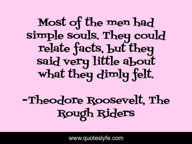 This page presents the quote "Most of the men had simple souls. They could relate facts, but they said very little about what they dimly felt.". Author of this quote is Theodore Roosevelt, The Rough Riders. This quote is about simple, men, souls, relations, feelings, facts, military,.
