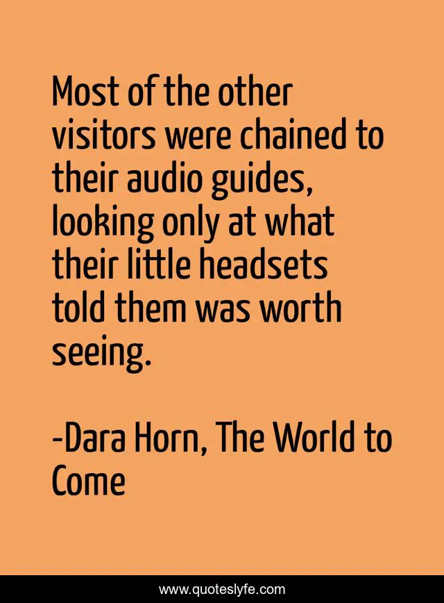 This page presents the quote "Most of the other visitors were chained to their audio guides, looking only at what their little headsets told them was worth seeing.". Author of this quote is Dara Horn, The World to Come. This quote is about funny, museum, comedy, art, audiotour,.