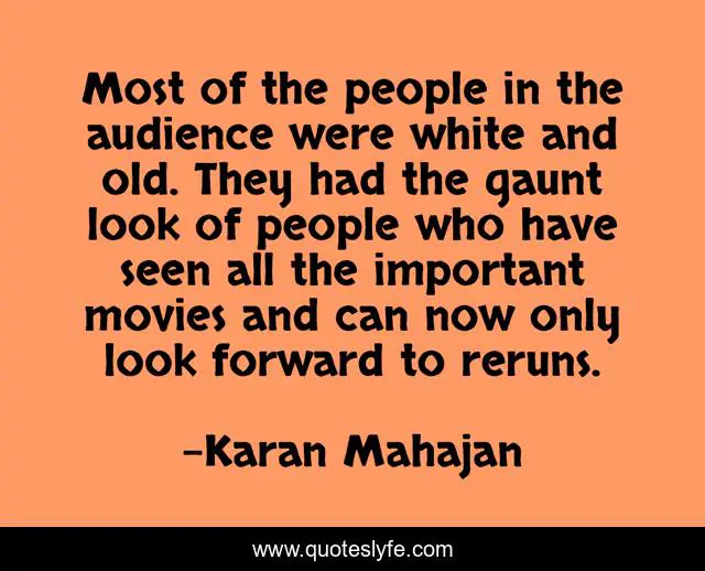 This page presents the quote "Most of the people in the audience were white and old. They had the gaunt look of people who have seen all the important movies and can now only look forward to reruns.". Author of this quote is Karan Mahajan. This quote is about reruns, old, people, gaunt, movies, audience, important,.