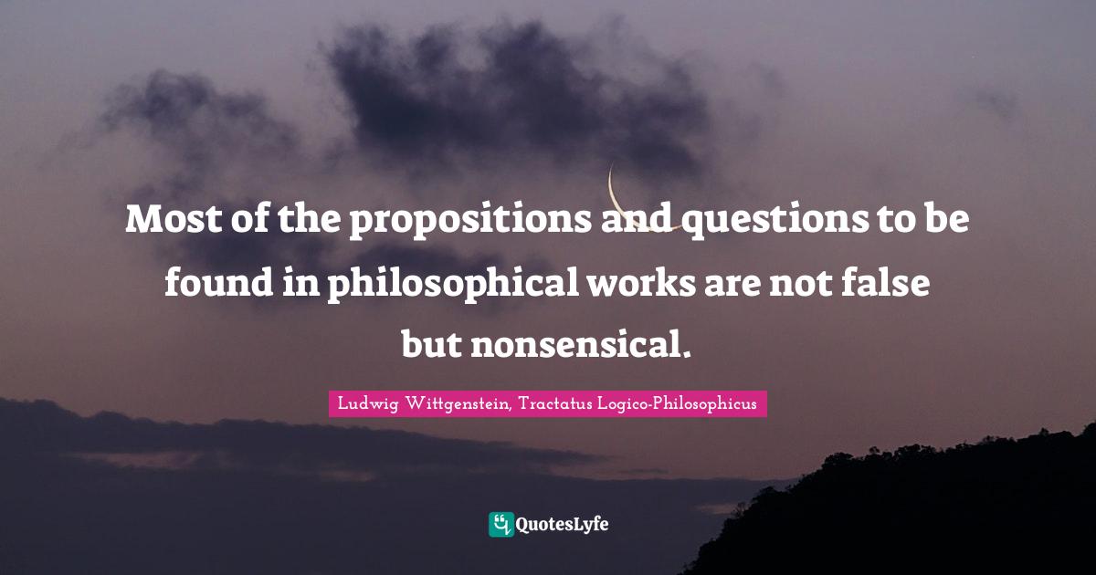 This page presents the quote "Most of the propositions and questions to be found in philosophical works are not false but nonsensical.". Author of this quote is Ludwig Wittgenstein, Tractatus Logico-Philosophicus. .