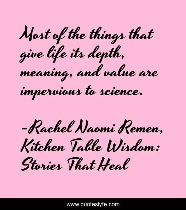 This page presents the quote "Most of the things that give life its depth, meaning, and value are impervious to science.". Author of this quote is Rachel Naomi Remen, Kitchen Table Wisdom: Stories That Heal. This quote is about science, meaning, life, depth, value,.