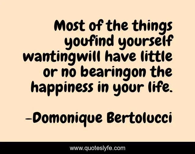 This page presents the quote "Most of the things youfind yourself wantingwill have little or no bearingon the happiness in your life.". Author of this quote is Domonique Bertolucci. This quote is about life-coaching, motivation, how-to-be-happier, life-coach, be-happy, how-to-be-happy, happiness-advice, happiness, be-more-motivated,.