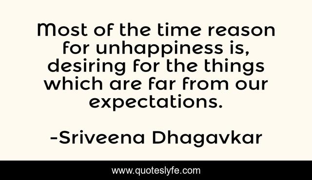 This page presents the quote "Most of the time reason for unhappiness is, desiring for the things which are far from our expectations.". Author of this quote is Sriveena Dhagavkar. This quote is about desires, expectations, happiness, unhappiness,.