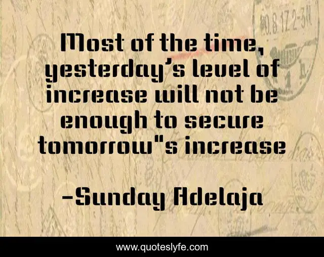 This page presents the quote "Most of the time, yesterday’s level of increase will not be enough to secure tomorrow"s increase". Author of this quote is Sunday Adelaja. This quote is about secure, level, tommorow, yesterday, increase, most, enough, time,.