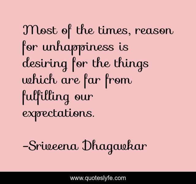 This page presents the quote "Most of the times, reason for unhappiness is desiring for the things which are far from fulfilling our expectations.". Author of this quote is Sriveena Dhagavkar. This quote is about desires, expectations, happiness, unhappiness,.