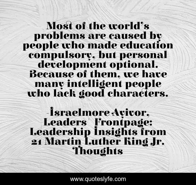 This page presents the quote "Most of the world’s problems are caused by people who made education compulsory, but personal development optional. Because of them, we have many intelligent people who lack good characters.". Author of this quote is Israelmore Ayivor, Leaders' Frontpage: Leadership Insights from 21 Martin Luther King Jr. Thoughts. This quote is about leaders, intelligence, martin-luther-king, college, education, martin-luther-king-jr, character, israelmore-ayivor, intelligent,.