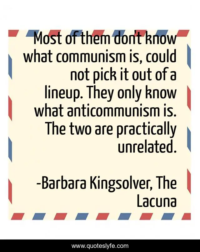 This page presents the quote "Most of them don't know what communism is, could not pick it out of a lineup. They only know what anticommunism is. The two are practically unrelated.". Author of this quote is Barbara Kingsolver, The Lacuna. This quote is about communism, barbara-kingsolver, dies-committee, mccarthyism, anticommunism, the-lacuna,.