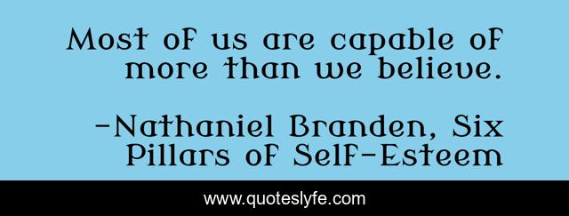 This page presents the quote "Most of us are capable of more than we believe.". Author of this quote is Nathaniel Branden, Six Pillars of Self-Esteem. This quote is about capability, potential,.