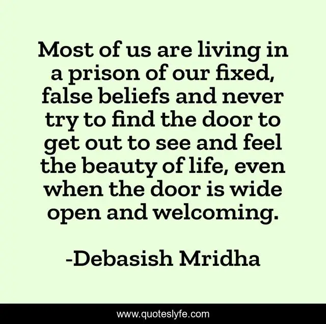 This page presents the quote "Most of us are living in a prison of our fixed, false beliefs and never try to find the door to get out to see and feel the beauty of life, even when the door is wide open and welcoming.". Author of this quote is Debasish Mridha. This quote is about life, love, knowledge, inspirational, intelligence, philosophy, wisdom, quotes, affection,.