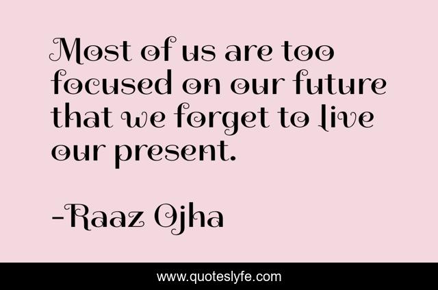 This page presents the quote "Most of us are too focused on our future that we forget to live our present.". Author of this quote is Raaz Ojha. This quote is about focussed, live-present, forget, success, future, living-life, happiness,.