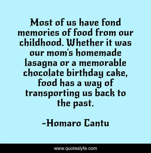 This page presents the quote "Most of us have fond memories of food from our childhood. Whether it was our mom's homemade lasagna or a memorable chocolate birthday cake, food has a way of transporting us back to the past.". Author of this quote is Homaro Cantu. This quote is about memories, birthday, mom,.