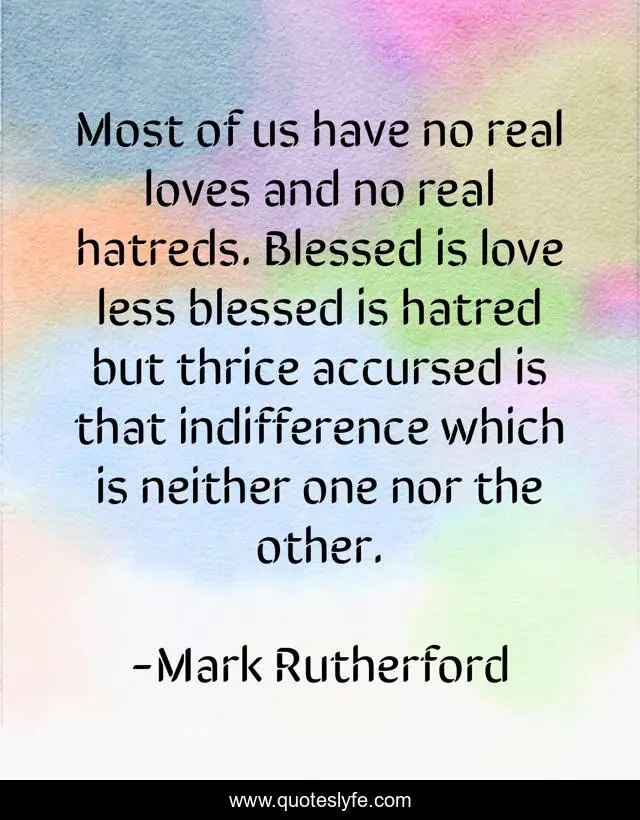 This page presents the quote "Most of us have no real loves and no real hatreds. Blessed is love less blessed is hatred but thrice accursed is that indifference which is neither one nor the other.". Author of this quote is Mark Rutherford. This quote is about apathy, indifference,.