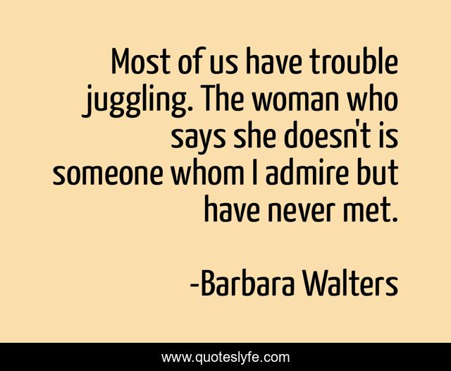 This page presents the quote "Most of us have trouble juggling. The woman who says she doesn't is someone whom I admire but have never met.". Author of this quote is Barbara Walters. This quote is about self, acceptance,.