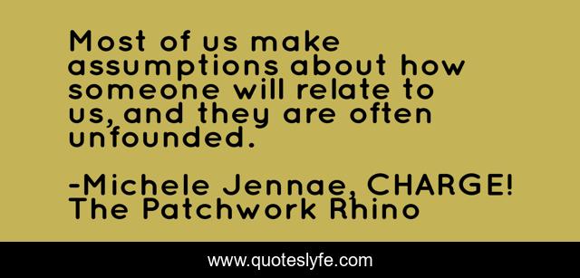 This page presents the quote "Most of us make assumptions about how someone will relate to us, and they are often unfounded.". Author of this quote is Michele Jennae, CHARGE! The Patchwork Rhino. This quote is about relationships, communication, benefit-of-the-doubt, assumptions,.