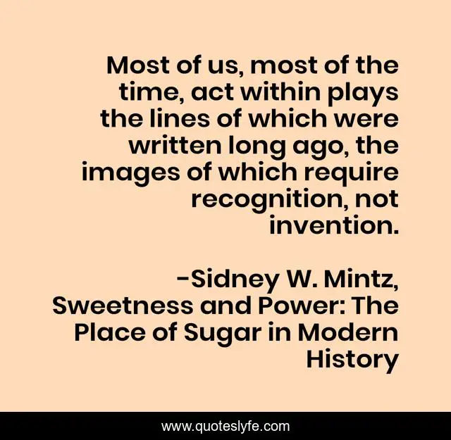 This page presents the quote "Most of us, most of the time, act within plays the lines of which were written long ago, the images of which require recognition, not invention.". Author of this quote is Sidney W. Mintz, Sweetness and Power: The Place of Sugar in Modern History. This quote is about humanity, power,.