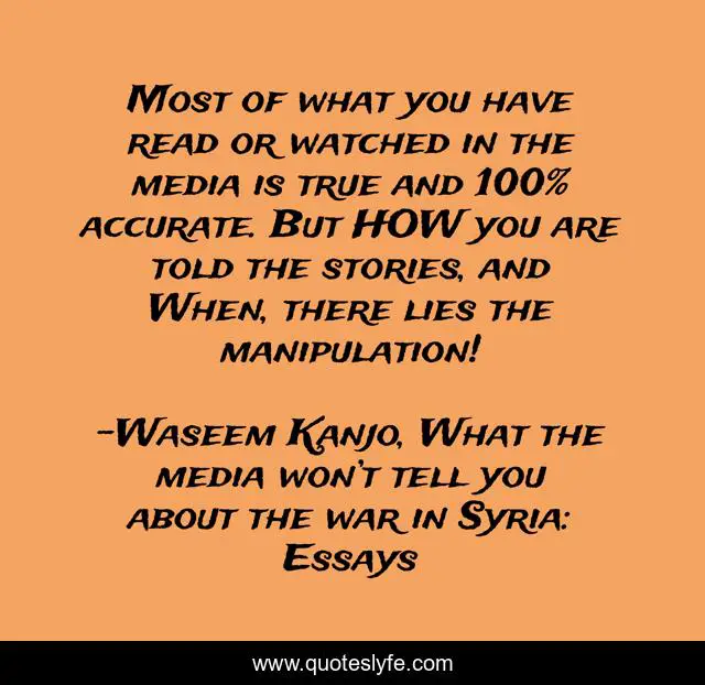 This page presents the quote "Most of what you have read or watched in the media is true and 100% accurate. But HOW you are told the stories, and When, there lies the manipulation!". Author of this quote is Waseem Kanjo, What the media won’t tell you about the war in Syria: Essays. This quote is about media, journalism, manipulation,.