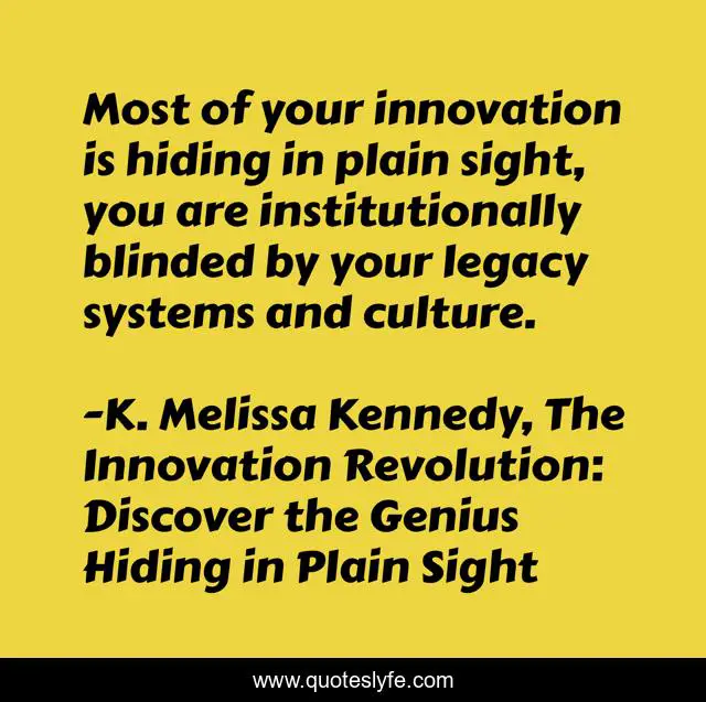 This page presents the quote "Most of your innovation is hiding in plain sight, you are institutionally blinded by your legacy systems and culture.". Author of this quote is K. Melissa Kennedy, The Innovation Revolution: Discover the Genius Hiding in Plain Sight. .