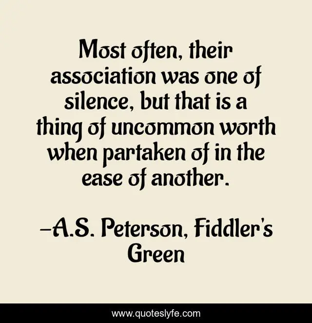 This page presents the quote "Most often, their association was one of silence, but that is a thing of uncommon worth when partaken of in the ease of another.". Author of this quote is A.S. Peterson, Fiddler's Green. This quote is about friendship, silence,.