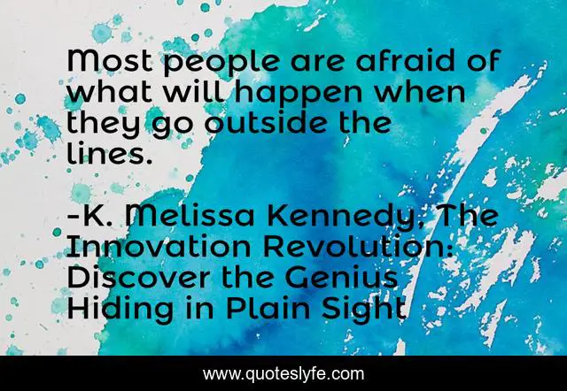 This page presents the quote "Most people are afraid of what will happen when they go outside the lines.". Author of this quote is K. Melissa Kennedy, The Innovation Revolution: Discover the Genius Hiding in Plain Sight. This quote is about fear, innovation,.
