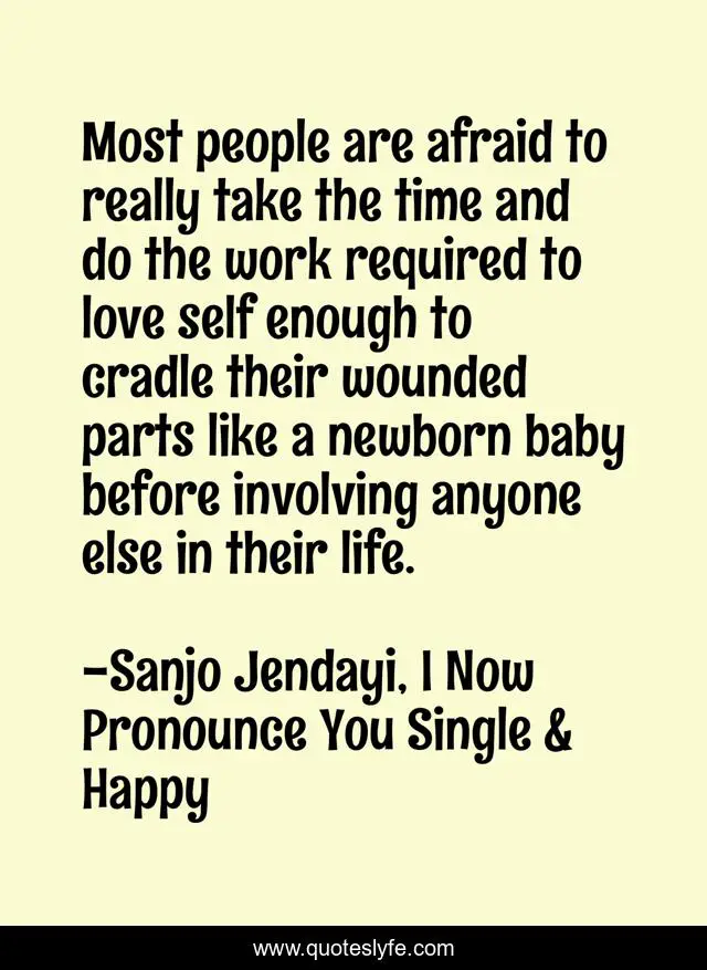 This page presents the quote "Most people are afraid to really take the time and do the work required to love self enough to cradle their wounded parts like a newborn baby before involving anyone else in their life.". Author of this quote is Sanjo Jendayi, I Now Pronounce You Single & Happy. This quote is about relationships, wounded, self-love, healing,.