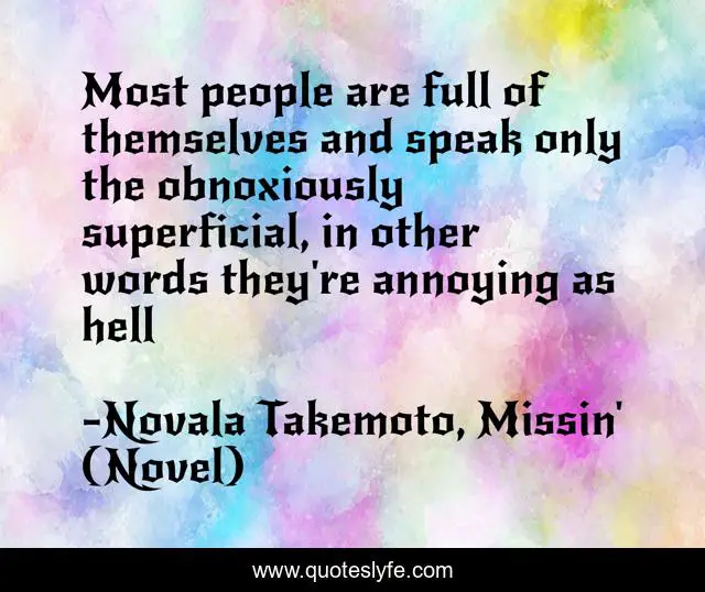 This page presents the quote "Most people are full of themselves and speak only the obnoxiously superficial, in other words they're annoying as hell". Author of this quote is Novala Takemoto, Missin' (Novel). This quote is about misanthropy, people,.