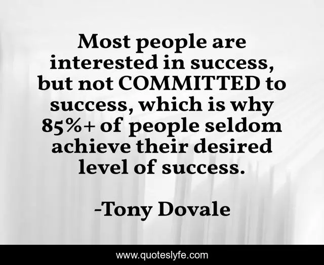 This page presents the quote "Most people are interested in success, but not COMMITTED to success, which is why 85%+ of people seldom achieve their desired level of success.". Author of this quote is Tony Dovale. This quote is about courageous-mindsets, swift-success, creativity, tony-dovale, leadership, innovation, lifemasters, revolutionary-workplace, staff-engagement,.