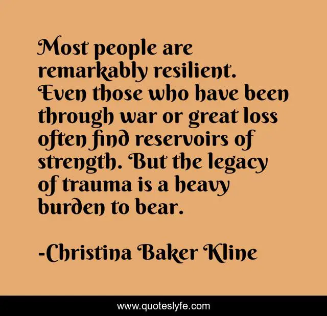 This page presents the quote "Most people are remarkably resilient. Even those who have been through war or great loss often find reservoirs of strength. But the legacy of trauma is a heavy burden to bear.". Author of this quote is Christina Baker Kline. This quote is about great, legacy, war,.
