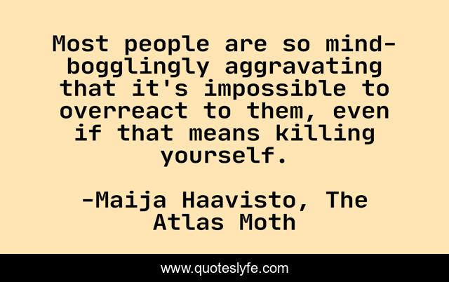 This page presents the quote "Most people are so mind-bogglingly aggravating that it's impossible to overreact to them, even if that means killing yourself.". Author of this quote is Maija Haavisto, The Atlas Moth. This quote is about death, people, suicide, nuisance, annoying, misanthropy,.
