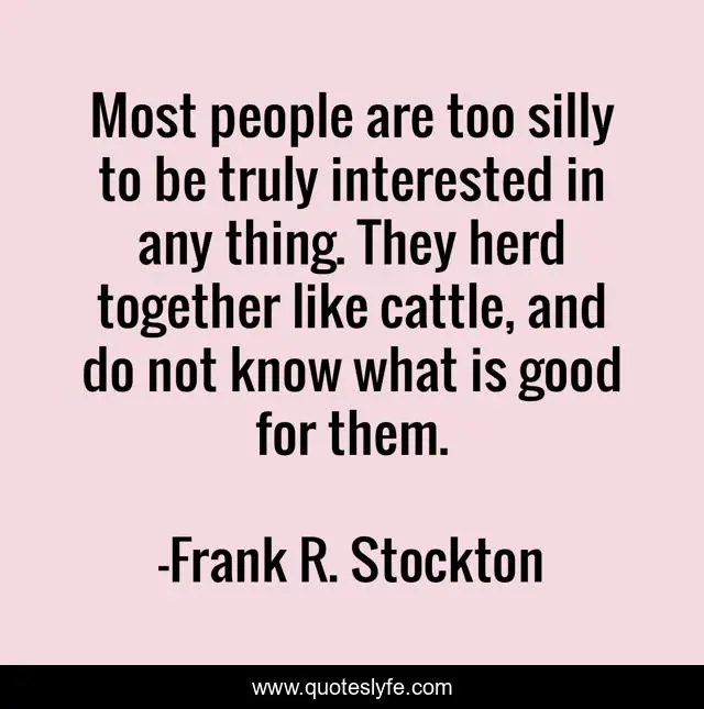 This page presents the quote "Most people are too silly to be truly interested in any thing. They herd together like cattle, and do not know what is good for them.". Author of this quote is Frank R. Stockton. This quote is about society, scepticism,.