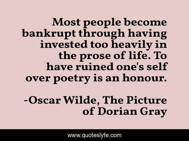 This page presents the quote "Most people become bankrupt through having invested too heavily in the prose of life. To have ruined one's self over poetry is an honour.". Author of this quote is Oscar Wilde, The Picture of Dorian Gray. This quote is about prose, life, poetry,.