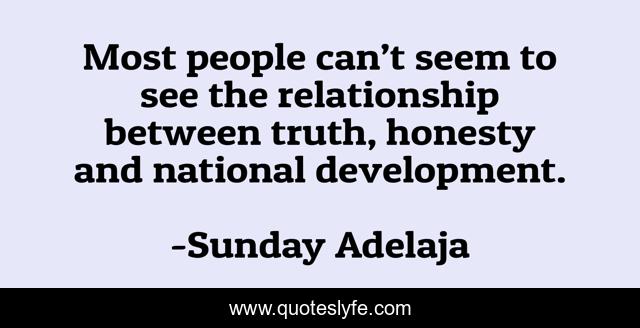 This page presents the quote "Most people can’t seem to see the relationship between truth, honesty and national development.". Author of this quote is Sunday Adelaja. This quote is about development, national, relationship, honesty, truth,.