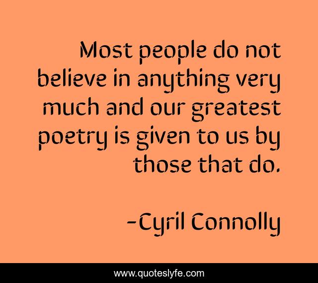 This page presents the quote "Most people do not believe in anything very much and our greatest poetry is given to us by those that do.". Author of this quote is Cyril Connolly. This quote is about poets, poetry,.