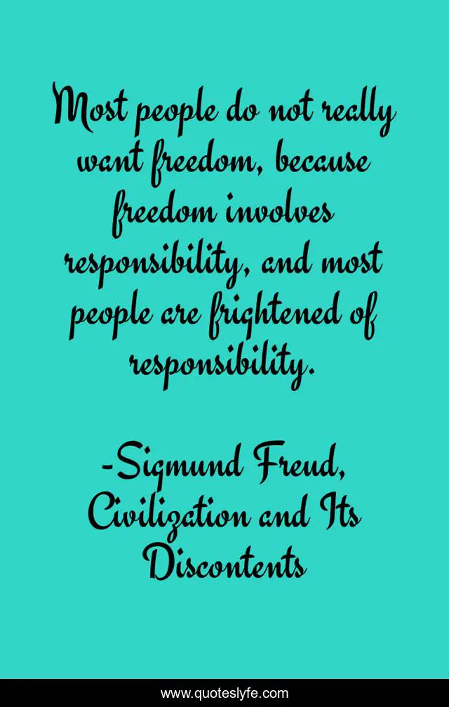 This page presents the quote "Most people do not really want freedom, because freedom involves responsibility, and most people are frightened of responsibility.". Author of this quote is Sigmund Freud, Civilization and Its Discontents. This quote is about freedom, fear, responsibility,.