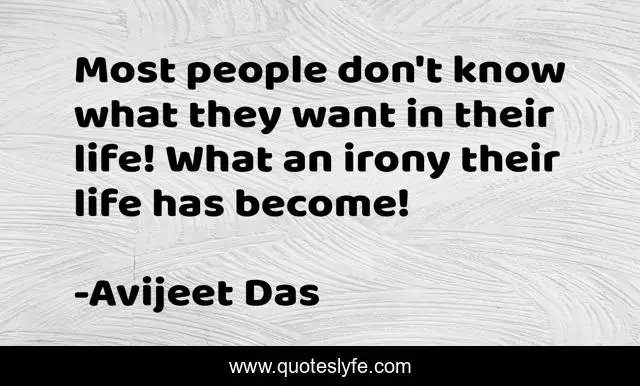 This page presents the quote "Most people don't know what they want in their life! What an irony their life has become!". Author of this quote is Avijeet Das. This quote is about life-and-philosophy, irony, life-and-living, meaning-of-life,.