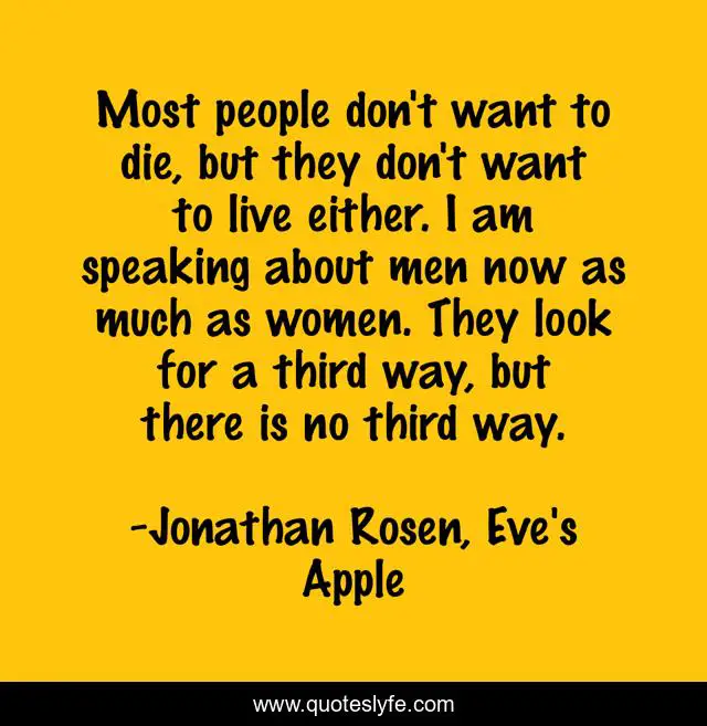 This page presents the quote "Most people don't want to die, but they don't want to live either. I am speaking about men now as much as women. They look for a third way, but there is no third way.". Author of this quote is Jonathan Rosen, Eve's Apple. This quote is about death, life-lessons,.