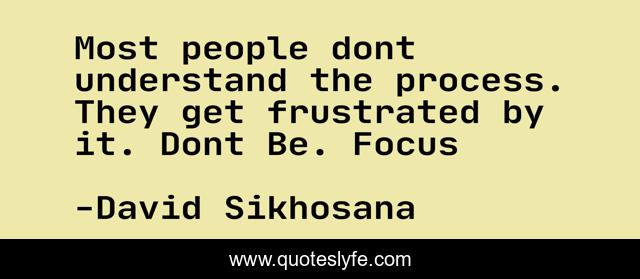 This page presents the quote "Most people dont understand the process. They get frustrated by it. Dont Be. Focus". Author of this quote is David Sikhosana. This quote is about wealth-magazine, belief, success, extraordinary, process, limitless, patience, poverty, trading,.