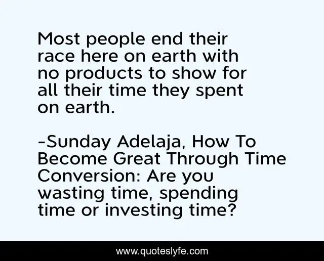 This page presents the quote "Most people end their race here on earth with no products to show for all their time they spent on earth.". Author of this quote is Sunday Adelaja, How To Become Great Through Time Conversion: Are you wasting time, spending time or investing time?. This quote is about people, life, earth, conversion, productivity, wealth, greatness, waste, humanity,.