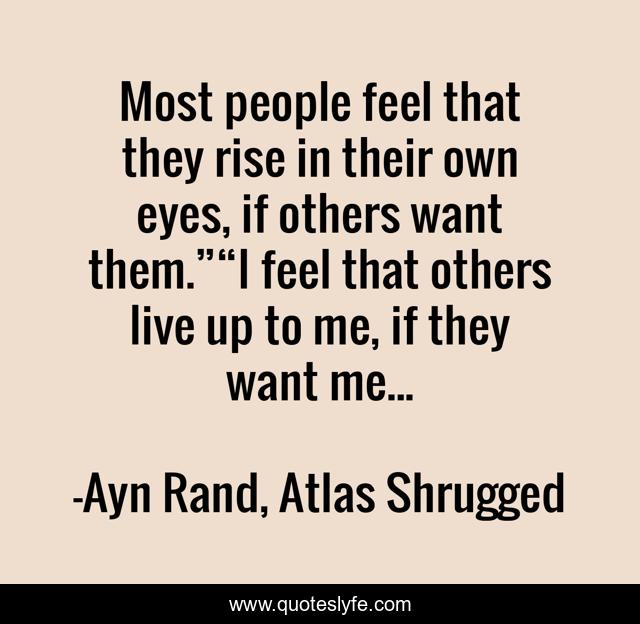 This page presents the quote "Most people feel that they rise in their own eyes, if others want them.”“I feel that others live up to me, if they want me...". Author of this quote is Ayn Rand, Atlas Shrugged. .