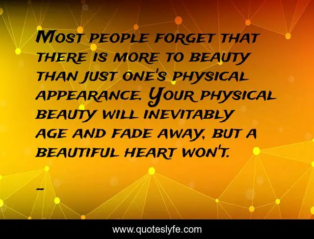 This page presents the quote "Most people forget that there is more to beauty than just one's physical appearance. Your physical beauty will inevitably age and fade away, but a beautiful heart won't.". Author of this quote is . This quote is about edmond-mbiaka, a-beautiful-heart, your-physical-beauty, your-physical-appearance, beauty,.