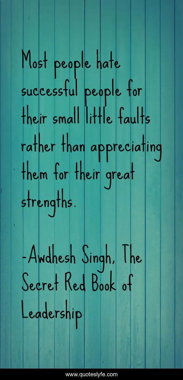 This page presents the quote "Most people hate successful people for their small little faults rather than appreciating them for their great strengths.". Author of this quote is Awdhesh Singh, The Secret Red Book of Leadership. This quote is about successful, leadershhip,.