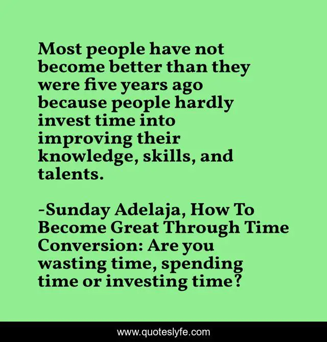 This page presents the quote "Most people have not become better than they were five years ago because people hardly invest time into improving their knowledge, skills, and talents.". Author of this quote is Sunday Adelaja, How To Become Great Through Time Conversion: Are you wasting time, spending time or investing time?. This quote is about people, improving-knowledge, life, investment, conversion, productivity, knowledge, time-investment, greatness,.