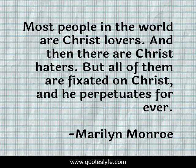 This page presents the quote "Most people in the world are Christ lovers. And then there are Christ haters. But all of them are fixated on Christ, and he perpetuates for ever.". Author of this quote is Marilyn Monroe. This quote is about reincarnation, religious, christ, marilyn,.