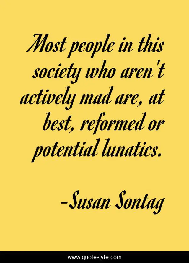 This page presents the quote "Most people in this society who aren't actively mad are, at best, reformed or potential lunatics.". Author of this quote is Susan Sontag. This quote is about potential, best, people,.